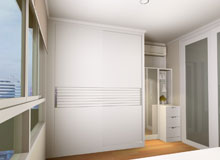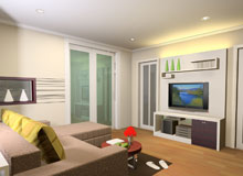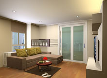 ห้องชุดในคอนโดมิเนียมของ LPN โครงการรามคำแหง พื้นที่ประมาณ 30-40 ตารางเมตร ท่านเจ้าของต้องการตกแต่งห้องชุดให้มีพื้นที่ใช้สอยมากที่สุด และกั้นพื้นที่ออกเป็นสัดส่วน คือส่วนของรับแขกและส่วนห้องนอนโดยใช้ประตูบานเลื่อนขนาดใหญ่ที่เป็นทั้งผนังห้อง และเป็นประตูเชื่อมระหว่างส่วน การออกแบบ Designer เน้นที่แบบสไตล์โมเดิร์นที่ลูกค้าชื่นชอบมาใช้ในการออกแบบ แต่เน้นที่ความเรียบง่าย หยิบเอากิมมิคเล็กๆ และสีสันใส่เข้าทำให้ห้องสดใสมากขึ้น |