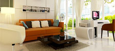 Designer ได้เลือกใช้เฟอร์นิเจอร์ลอยตัวที่ดูโมเดิร์น และเป็นเอกลักษณ์เฉพาะตัว ตั้งแต่โซฟาสีส้มจี๊ดจ๊าด หรือจะเป็นโต๊ะทำงานรูปตัว D ที่เข้ากันกับโต๊ะข้างตัวเล็กสำหรับวาง Printer และเป็น Mirror ของ D ตัวใหญ่ในส่วนโต๊ะทำงาน |