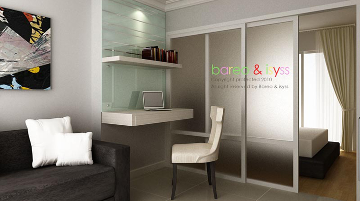 การแบ่งพื้นที่ส่วนนี้กับพื้นที่ส่วน living room มีการใช้เฟรมกระจก และใช้ประตูบานเลื่อน เพื่อประหยัดเนื้อที่ โดยติด sticker ฝ้า ทั้งส่วนผนัง และ ประตู เพื่อสร้างความเป็นส่วนตัวภายในจากส่วน living room