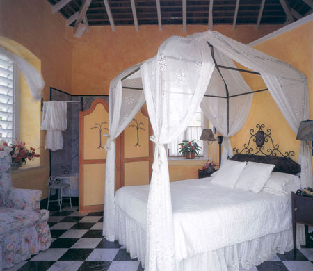 ห้องนอนเล่นสีจากผนังปูนสีเหลือง พื้นเล่นลายสลับเป็นตารางหมากรุก วางเตียงเหล็กสี่เสา แสดงเส้นโค้งทั้งด้านบนและหัวเตียง วางกลางห้องเพิ่มความอ่อนหวานด้วยผ้าโปร่ง ยาวห้อยชาย 4 ด้าน