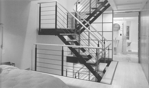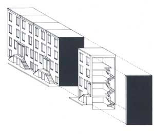 รูปด้านหน้าของอาคาร Town House แห่งหนึ่งใน New York ที่มีการใช้เส้นสายที่เรียบง่าย และการเจาะช่องแสงที่เป็นจังหวะ เรียกร้องความสนใจของบุคคลภายนอกที่มีต่อกิจกรรมภายในอาคารได้เป็นอย่างดี |
