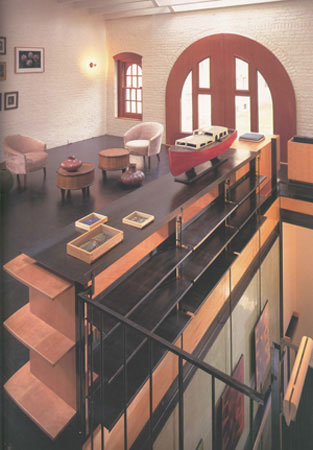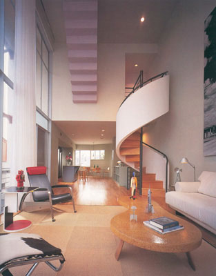 ภาพแสดงบรรยากาศภายใน Town House อีกภาพหนึ่ง ที่ใช้ Double Volume Space ในการสร้างความโอ่โถงของบ้าน และออกแบบรูปทรงของบันไดให้กลายเป็นจุดสนใจของห้อง ในขณะที่มีการเจาะช่องแสงขนาดใหญ่เพื่อคลายความอึดอัดของบ้าน ทำให้เป็นบ้านที่น่าอยู่มาก |