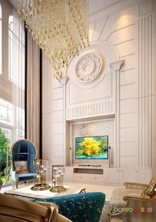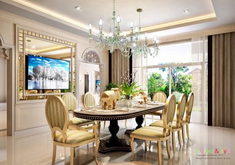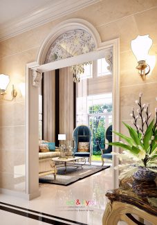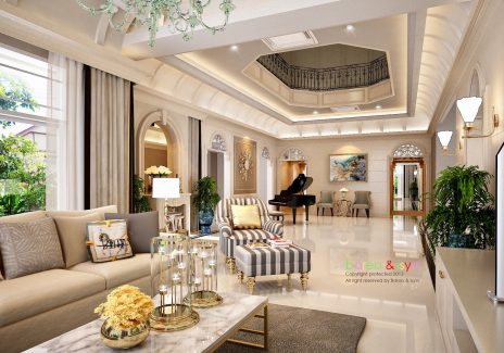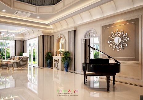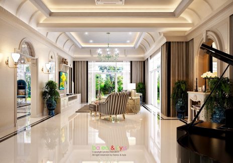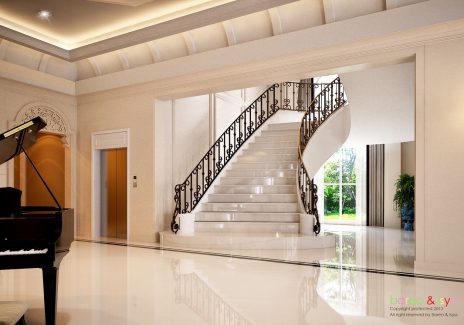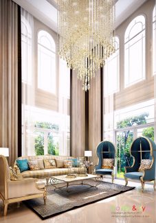 ในส่วนของบ้านนั้น เน้นให้ความรู้สึกหรูหราและสง่างาม ดังนั้นจึงดึงสไตล์ Classic Luxury ที่ให้ความรู้สึกอลังการและมีรสนิยม การเลือกใช้สีโทนอ่อนช่วยให้บ้านดูสว่างและโปร่งขึ้น อีกทั้งพื้นที่บริเวณบ้านที่กว้างอยู่แต่เดิม เมื่อบวกกับ Space แบบ Double Volume และบันไดโค้งแล้ว จึงทำให้เกิดความงามที่เป็นเอกลักษณ์