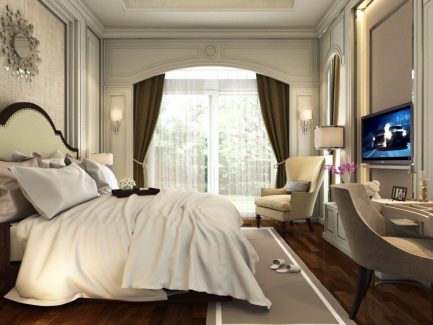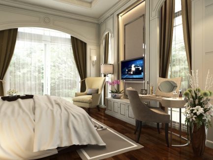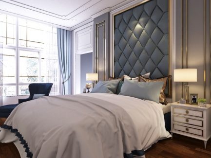 การใช้สีทองกับเส้นโค้งมาเล่นในงานออกแบบ ทำให้บรรยากาศของห้องดูงามสง่า เมื่อบวกลวดลายที่ขอบหัวเตียงเข้าไป จะยิ่งทำให้ห้องดูภูมิฐานมากขึ้น นอกจากนี้ใน Master Bedroom นั้น Designer ได้ซ่อนลูกเล่นไว้ตรงตู้เสื้อผ้าที่มีชั้นวางกระจกล้อมรอบตู้ เป็นอีกหนึ่งสิ่งที่ช่วยทำให้ห้องดูมีชีวิตชีวามากขึ้น
