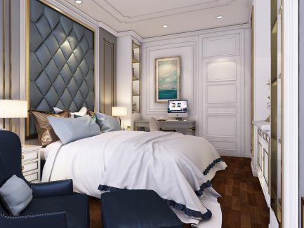 ใน Bedroom 2 เน้นการตกแต่งแบบ Modern ซึ่งออกแบบขึ้นตามความต้องการของเจ้าของห้องที่เป็นคนสมัยใหม่ ทำให้ห้องที่ออกมาดูเรียบง่าย แต่เท่ มีสเน่ห์และใช้งานสะดวก แตกต่างจาก Bedroom 3 ที่ถูกออกแบบให้เป็นห้องนอนแนว Luxury ที่ใช้สีโทนฟ้าตกแต่งเป็นส่วนมาก ส่งผลให้ห้องไม่ดูอึดอัด และยังมีบรรยากาศเฉพาะตัวที่สงบ อบอุ่น เหมาะสำหรับการพักผ่อน