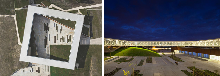 สิ่งก่อสร้างทรงสี่เหลี่ยมจัตุรัสที่มีช่องโหว่ตรงกลางเหมือนกับกรอบรูปอันใหญ่แห่งนี้ คือ ลานสาธารณะสำหรับให้ชาวเมืองใช้ทำกิจกรรมร่วมกัน แต่แทนที่จะสร้างเป็นลานจัตุรัสธรรมดาๆ อย่างเดิม กลับออกแบบให้เป็นลานกิจกรรมบนเนินหญ้า ที่ล้อมรอบด้วยทางเดินยาวซึ่งตีกรอบเป็นทรงเลขาคณิตที่มีเอกลักษณ์และดูน่าสนใจแทน นอกจากนี้ที่ชั้นล่างสุดใต้กรอบทางเดิน ยังมีพื้นที่ที่แบ่งเป็นห้องประชุม ห้องเอนกประสงค์ และร้านค้าเล็กๆ อีกด้วย