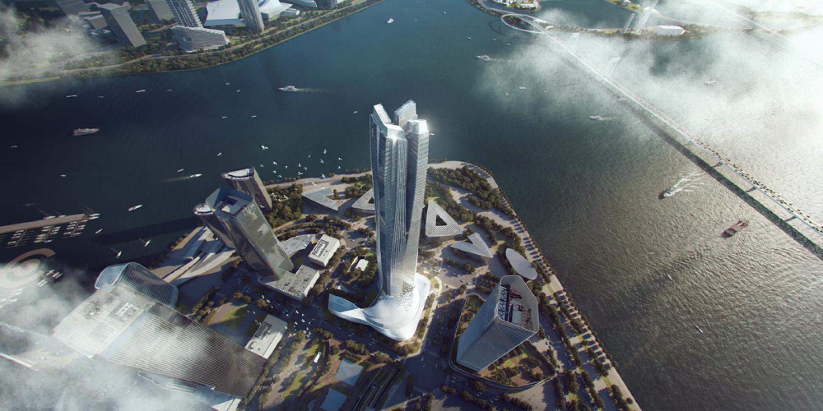 แนวคิดของการออกแบบตึกนี้ คือการผสมผสานความเชื่อดั้งเดิมเข้ากับรูปร่างของสถาปัตยกรรม โดยการนำมังกร 9 ตัว ที่โผล่ขึ้นเหนือท้องทะเล จากภาพเขียนในยุคราชวงศ์ซ่งใต้มาใช้เป็นสัญลักษณ์ ตามความคติของชาวจีนที่เชื่อว่ามังกรสื่อถึงชีวิตใหม่ การก้าวข้ามขีดจำกัด ความเจริญ และความเป็นนิรันดร์ ตึกนี้จึงเป็นตัวอย่างของการออกแบบสไตล์ จีนร่วมสมัยที่สะท้อนให้เห็นถึงความเจริญก้าวหน้าของประเทศจีนได้เป็นอย่างดี โดยคาดการณ์ว่าในปี 2020 ที่ตึกนี้สร้างสำเร็จ จะทำให้ย่านธุรกิจใหม่แห่งนี้เจริญขึ้นอีกหลายเท่าตัว