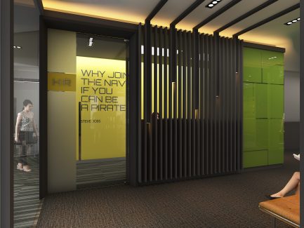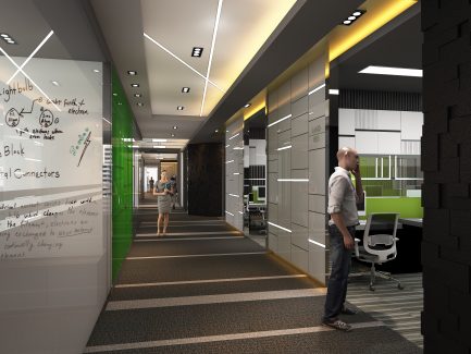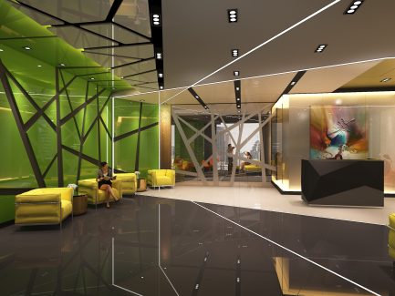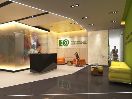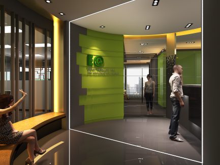 “ออฟฟิศในตึกสูงใจกลางกรุงเทพมหานคร ที่ตกแต่งด้วยสไตล์ Futuristic ผสมผสานกับสไตล์ Modern Luxury และเฉดสีเขียวซึ่งเป็นสีของธรรมชาติ การผสมผสานอย่างลงตัวของความเป็นธรรมชาติและความทันสมัย ใน theme ของความเป็นไทยแบบประยุกต์”