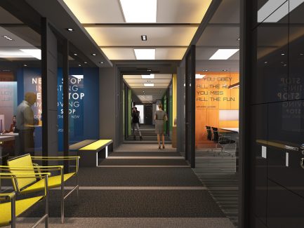 การตกแต่งพื้นที่ภายในออฟฟิศที่อยู่บนอาคารชั้นเดียวอาจทำให้รู้สึกอึดอัด ดังนั้นดีไซเนอร์จึงได้ดีไซน์ฝ้าเพดานให้เป็นฝ้าดรอปหลุม และ ซ่อนไฟบริเวณขอบบนของผนังเพื่อให้พื้นที่ดูกว้างขึ้น การใช้สไตล์ Futuristic ที่มีการเคลื่อนไหวทำให้ภายในบริษัทล้ำสมัย รวมไปถึงเมื่อผสมผสานกับสไตล์ Modern Luxury ทำให้ภาพลักษณ์ของบริษัทดูภูมิฐานมากขึ้น ส่วนการแยกพื้นที่ล็อบบี้ออกเป็น 2 โซน โดยจะแบ่งออกเป็นโซนสำหรับบริษัทภายนอกที่เข้ามาติดต่อทำธุรกรรมภายในบริษัท ส่วนอีกโซนจะเป็นโซนสำหรับลูกค้าทั่วไปเพื่อเพิ่มศักยภาพในการรับรองแขกผู้มาเยือน